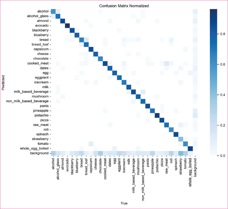 FIGURE 1. Normalized confusion matrix showing class-specific detection performance of the YOLOv8n model on the Allergen30 test set. The matrix highlights high accuracy and low rates of misclassification for the majority of allergenic food classes analyzed.